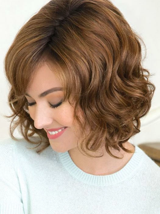 The Reign Wig by Amore is a short layered bob with tousled waves and a side-swept fringe. Reign features both a double monofilament top and a lace front for off the face styling and a natural looking hairline.
