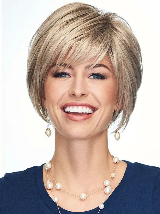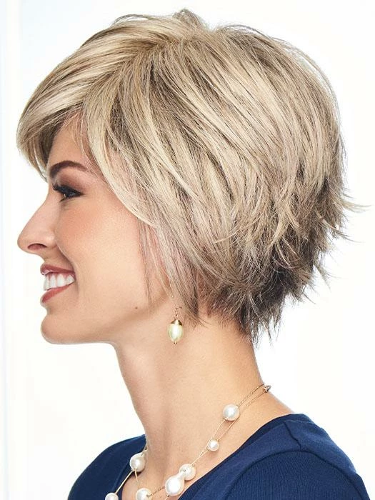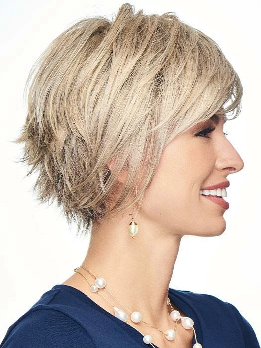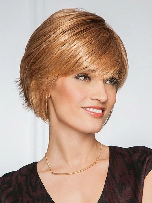 Innuendo by Gabor is a short, choppy bob wig with razored ends. This contemporary cut combines long, sleek layers around the face and sides with lots of textured ends in the back. A quick shake right out of the box and its ready to wear!