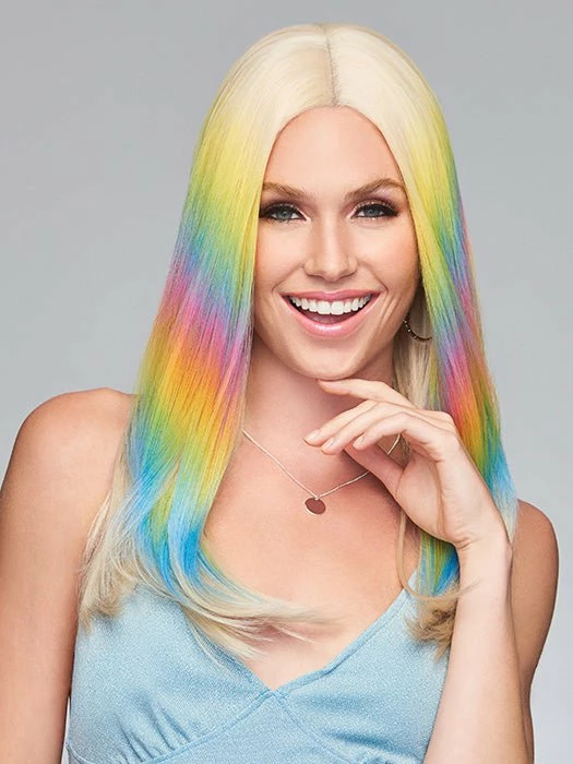 Dance Till Dawn by Hairdo features a burst of pastel rainbow hues on platinum blonde hair. This style creates a fantasy look that appears as real as ever thanks to a smooth top, monofilament center part and lace front hairline. The Tru2Life heat-friendly synthetic fiber lets you change it up from straight to wavy in a flash.