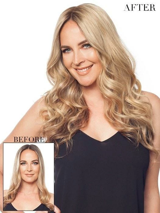 easiPart XL Human Hair 18” by easihair is a clip in hair topper that adds seamless volume and coverage on the top of the head and along the part. The easiPart XL base is made of a fine hand-tied monofilament base that measures 5” x 3” – 5.75”. easiPart XL is ideal for concealing thinning hair on the top and along the part. The placement, size, and shape add volume and thickness overall and also covers root growth in between color services.