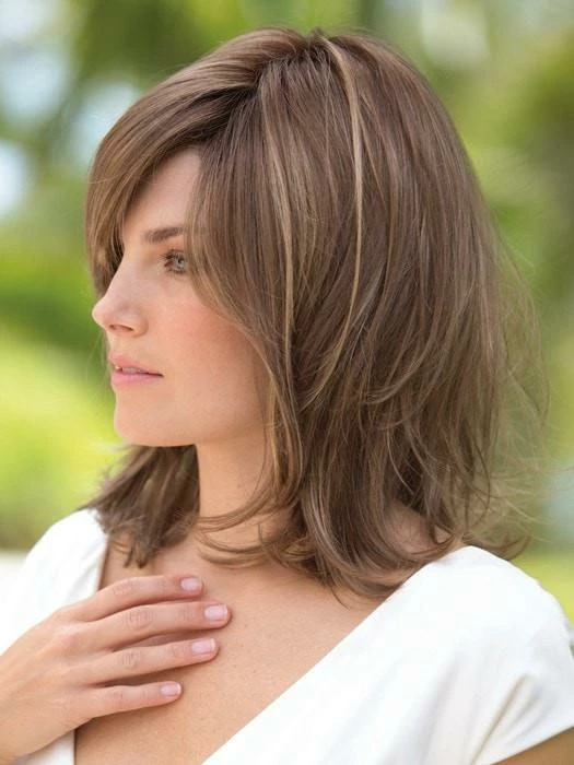 Kenzie by Noriko is a voluminous and layered synthetic wig with a full side bang. The part is hand-tied and looks natural even up close! This mid-length style has fullness at the crown and movement throughout. To further personalize, have your stylist thin the side bang or add a full bang. To change up your look you can tuck one side behind the ear.