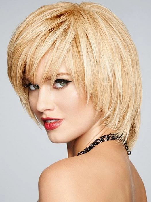 Applause by Raquel Welch is a supremely natural human hair wig. All face shapes are enhanced with this layered, short cut. The cap construction was designed to give you the ultimate in natural look and feel. It includes a 100% hand-tied cap with a lace front and monofilament top. Wear it soft and feathery or tousled and flared – human hair will allow you to create either look.