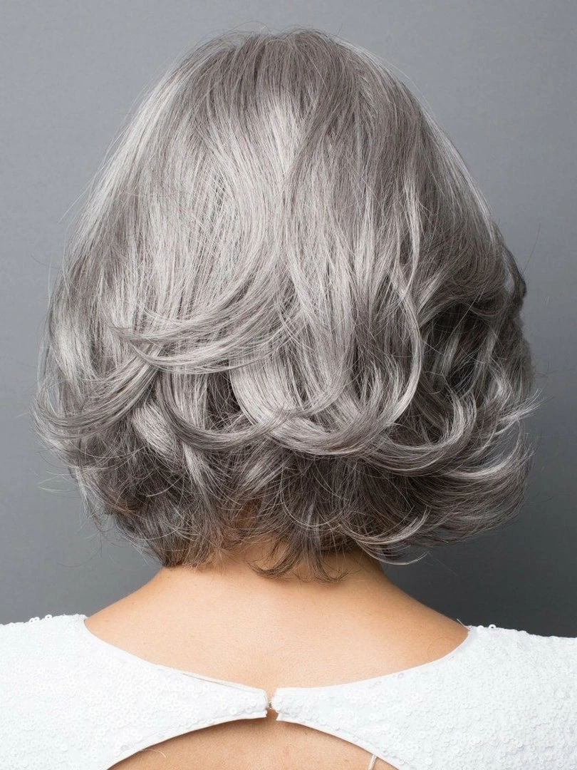Amal by Rene of Paris is a mid-length, layered, and wavy synthetic wig. The basic top supports the base and adds lift and volume. This style is a long bob cut with layers around the face for a flattering and natural look. The bang is longer and can be customized by your stylist. To define the curls, add the Shaping Creme by BeautiMark.