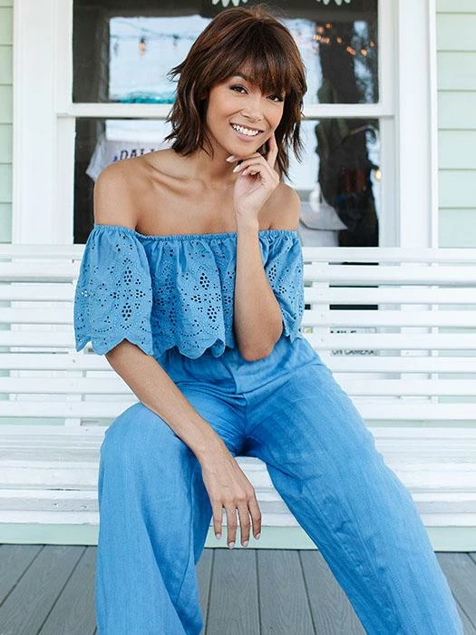 The Heat Friendly New Wave Wig by TressAllure is a mid-length layered bob with feathered bangs, a smooth silky top and textured layers that fall below the collar. This slightly longer bob blends multi-textures with contoured layering for a lightweight feel and plenty of volume. The flowing sides frame the face perfectly.